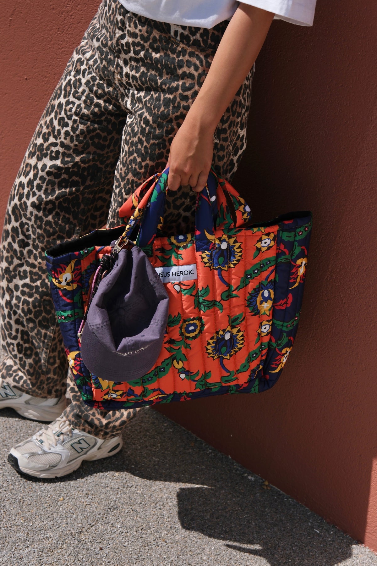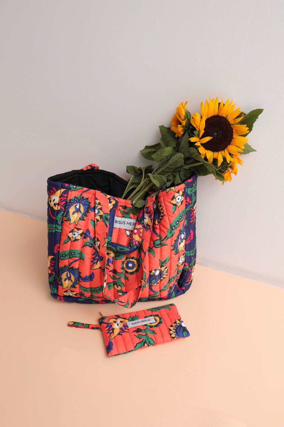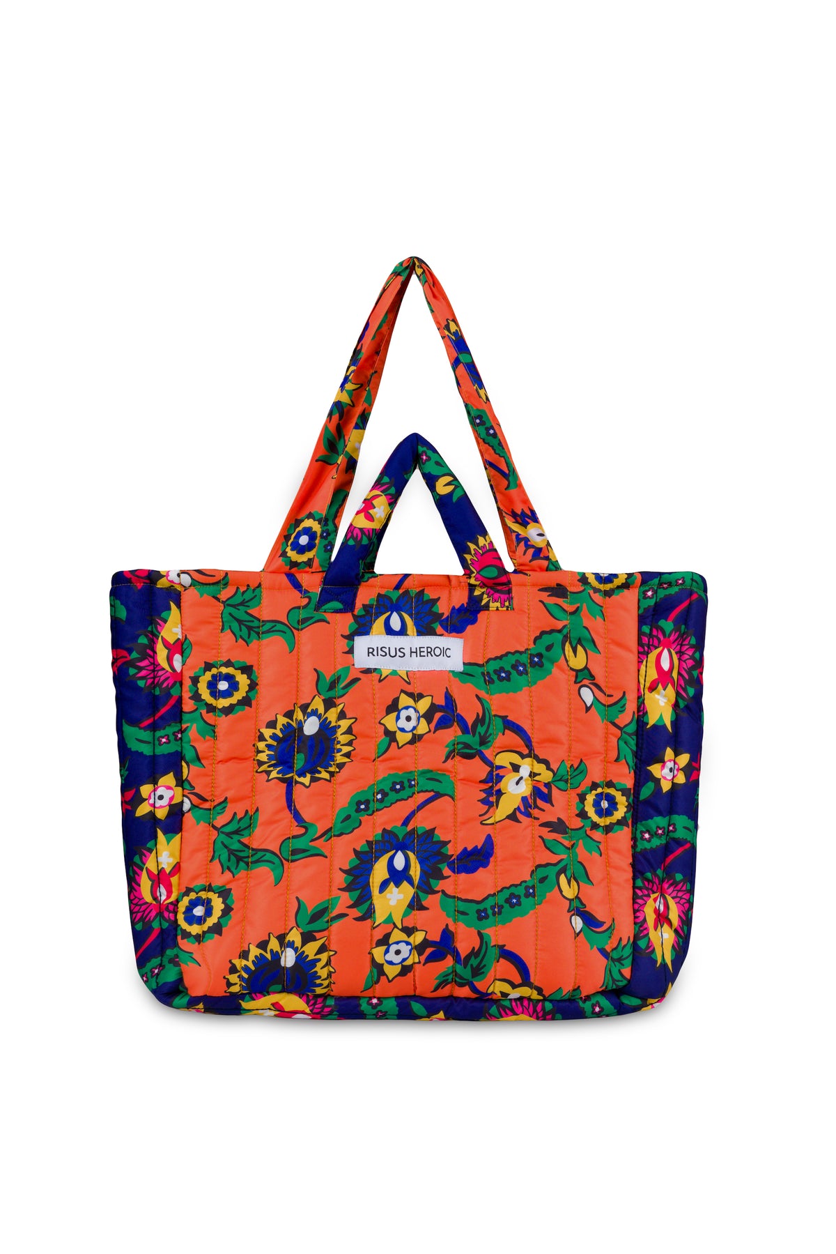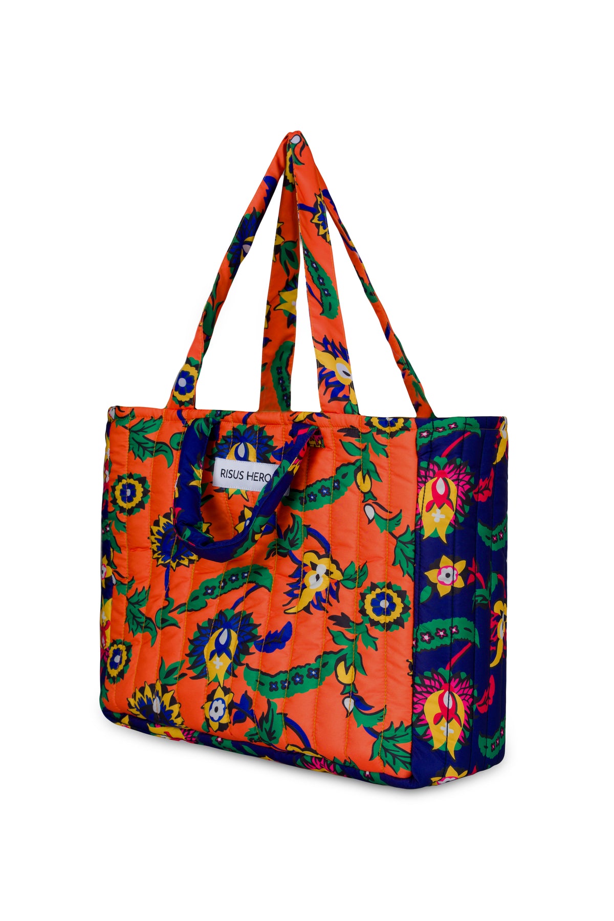 Turuncu Lacivert Çiçek Desenli Tote Çanta